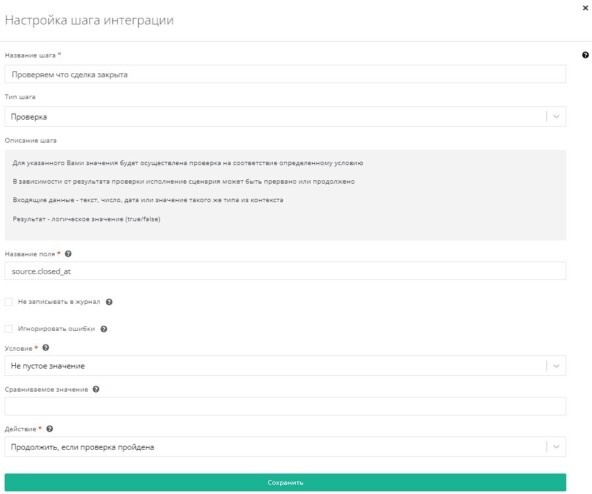 Используем инструмент Проверка по полю source.closed_at. Условие - не пустое значение, действие - Продолжить, если проверка пройдена.