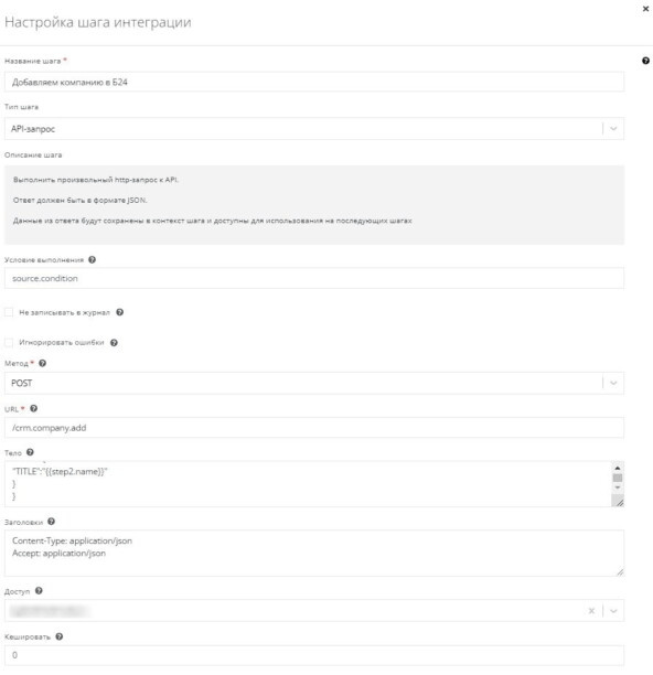 Тело запроса:{ "fields":{ "TITLE":"{{step2.name}}" } }