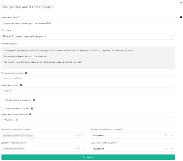 Используем Поиск ID соответствующий сущности по полю step2.id Выбираем в обоих сервисах сущность Компания.