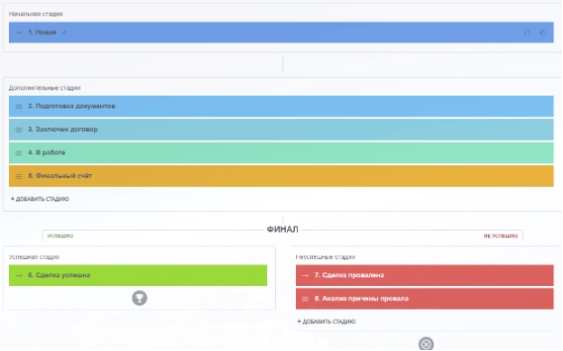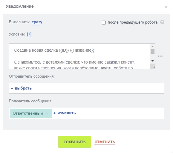 Для стадии Новая был настроен Робот, который уведомлял сотрудника о поступлении новой сделки