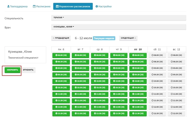 Далее, настраиваем расписание, выбирая время и даты, в которые будет проводиться прием и нажимаем кнопку Сохранить.
