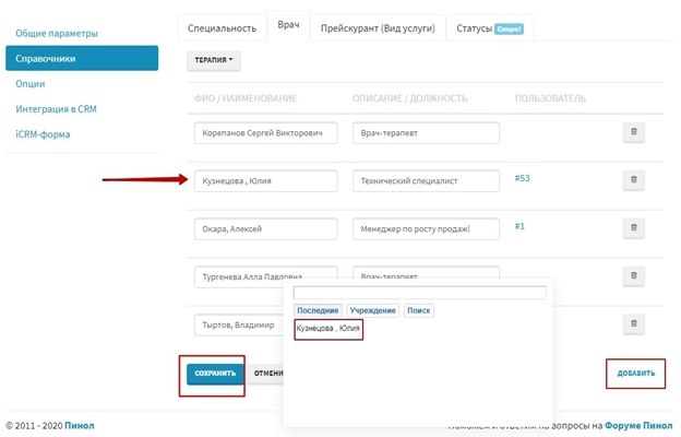 Раннее, создать список специальностей и врачей, мог сотрудник, имеющий соответствующие права доступа, в разделе «Настройки».