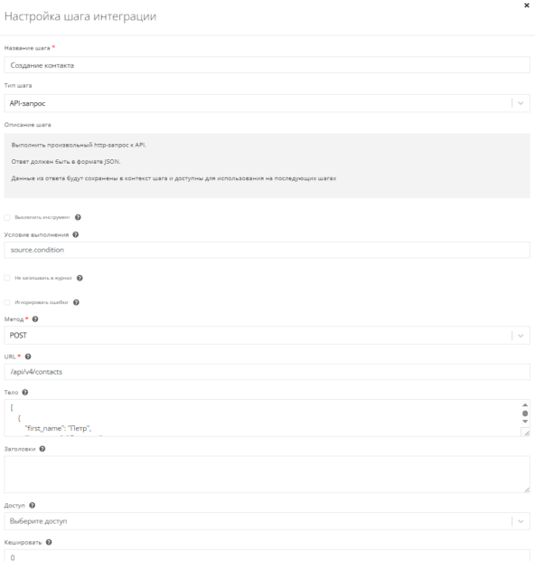 Метод запроса - POST, укажем URL /api/v4/contacts.