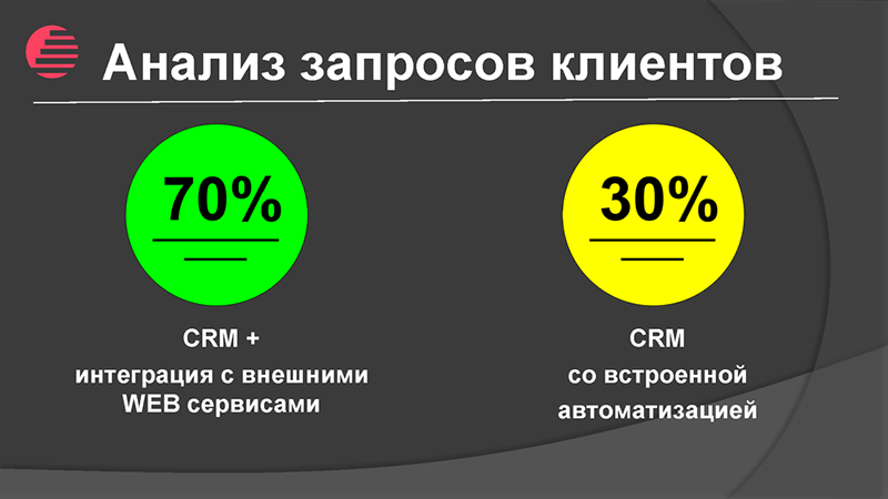 По нашему опыту, примерно в 70% случаев клиенту нужна не просто «коробочная» настройка, а полноценное подключение CRM к экосистеме внешних сервисов — телефонии, e-mail-рассылок и так далее.