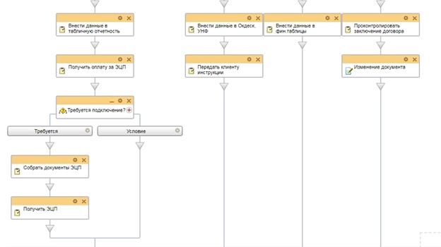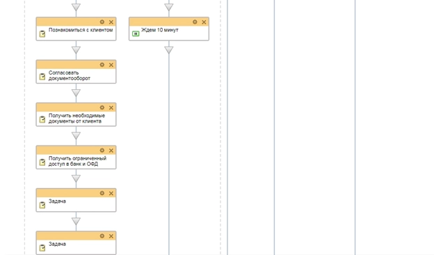 Требовалось разработать бизнес-процесс, при помощи которого будет происходить постановка компаний на бухгалтерское обслуживание. В процессе должны учувствовать разные отделы с определенными заданиями.