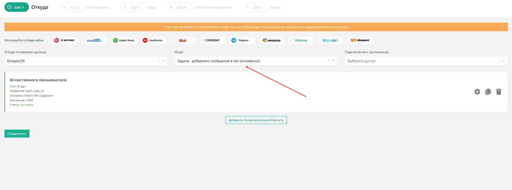 Финальный шаг — настройка самой интеграции в Пинкит.