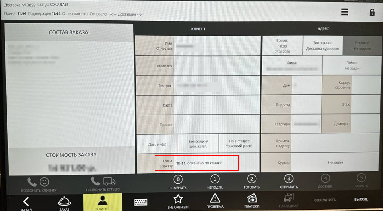 - Сотрудник в зале или на кассе в iikoFront уточняет детали: добавляет или убирает позиции, применяет промокод или скидку по программе лояльности, корректирует адрес, подъезд, комментарий к доставке.