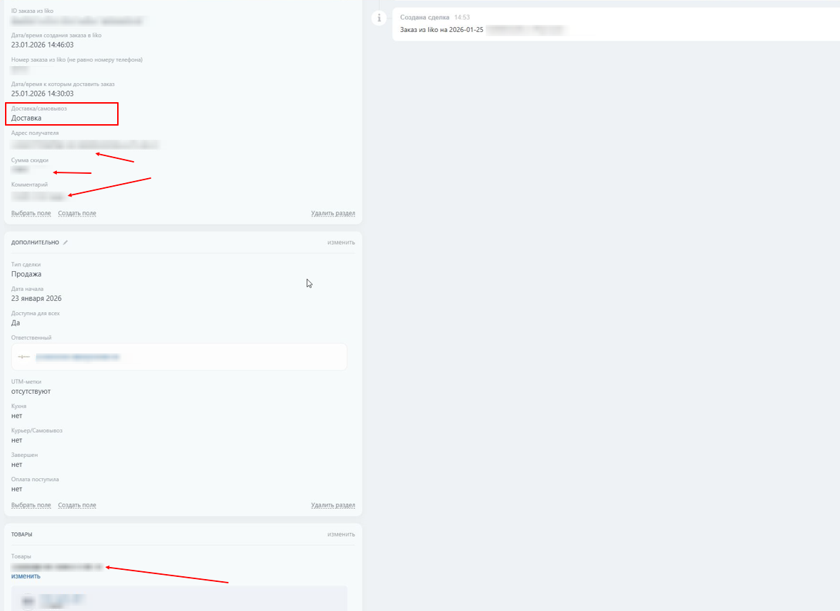 Уже через несколько секунд в Битрикс24 обновлен адрес, применена корректная скидка, сумма полностью совпадает с чеком, все товары привязаны к сделке.