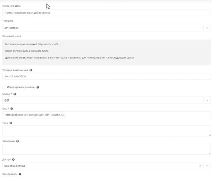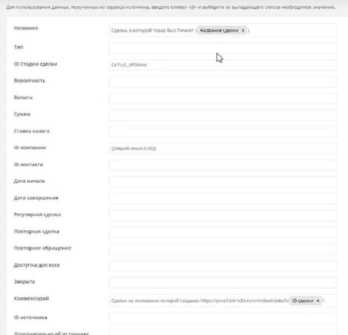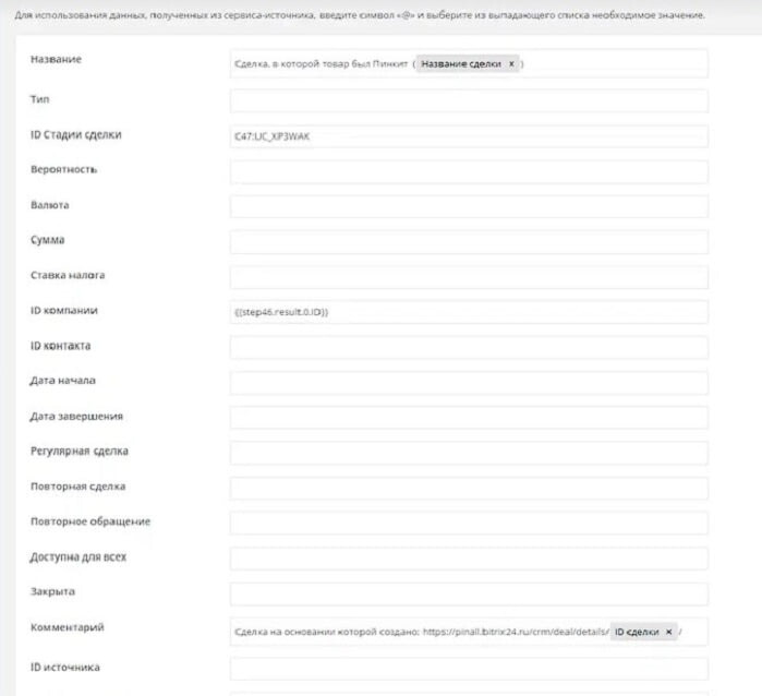 Настраиваем, какие поля будут переданы: название новой сделки, ID компании, комментарий с указанием исходной сделки и т.д.