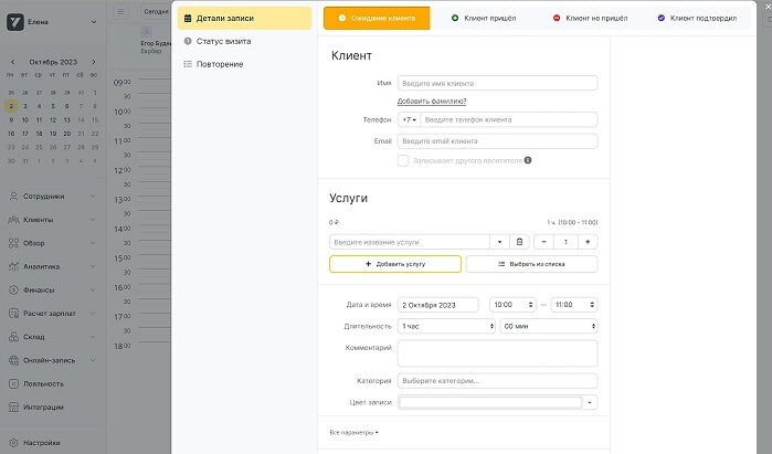 - Полный контроль и аналитика. История посещений, изменения в записи, списание расходников (например, краски для волос), и даже коммуникация — всё в одном месте.