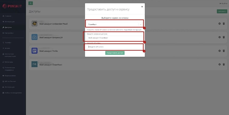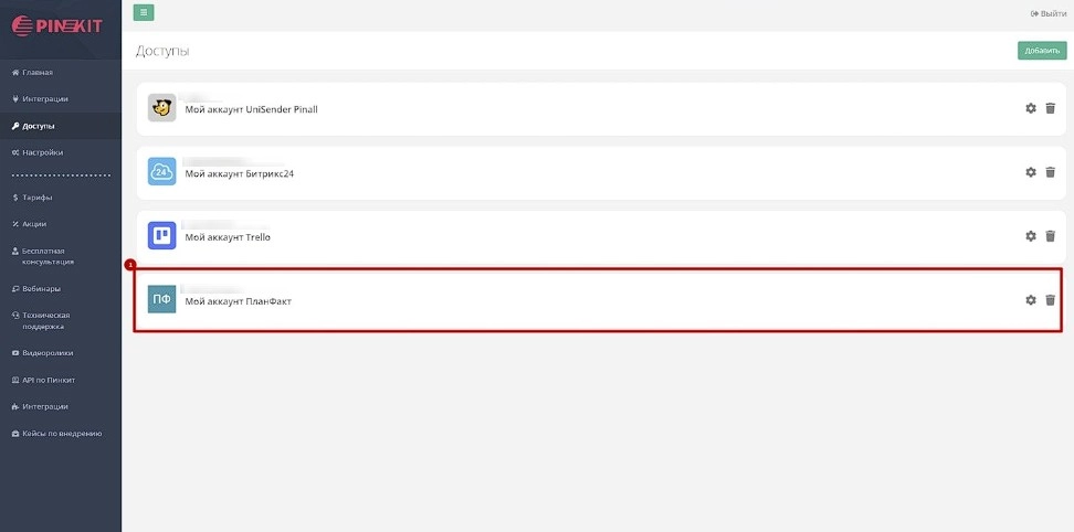 Заходим в личный кабинет Пинкит, открываем раздел "Доступы" и нажимаем "Добавить".