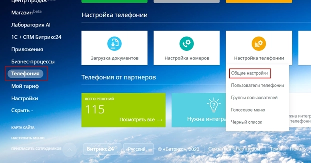 Чтобы при клике по трубке рядом с контактом в Битрикс24 совершался исходящий звонок клиенту, перейдите в раздел Настройки телефонии - Общие настройки.