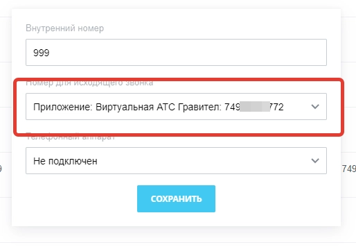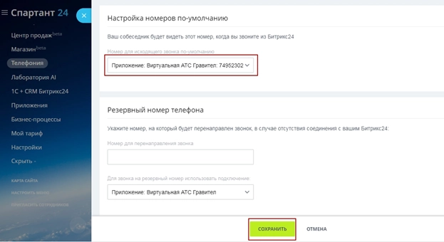 В Настройке номеров по умолчанию выберите вариант "Приложение: Виртуальная АТС Гравител" и сохраните изменения: