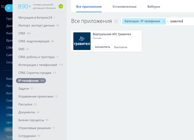 В CRM зайдите в раздел "Все приложения", выберите категорию "IP-телефония", найдите и нажмите на виджет "Виртуальная АТС Гравител"