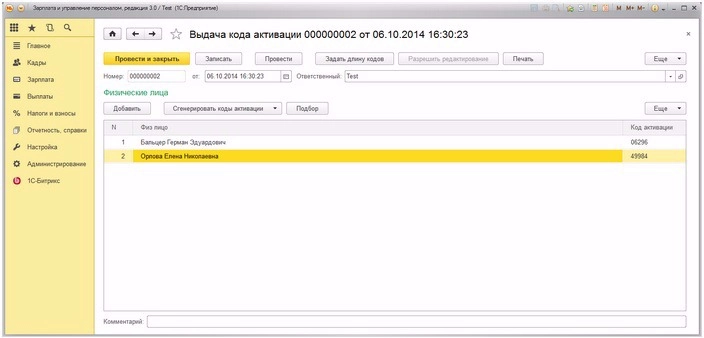 Код активации генерируется автоматически при добавлении сотрудника. Но также можно его сгенерировать автоматически как для выделенного сотрудника, так и для всех в табличной части сразу.