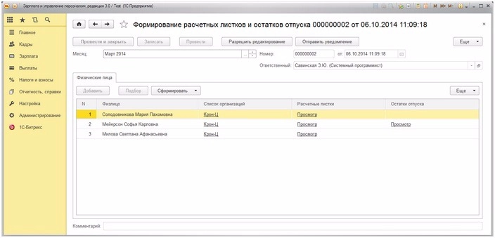 Формирование расчетных листков и остатков отпуска сотрудникам