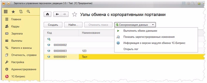 Если модуль обмена был корректно установлен, то в 1С появляется раздел 1С-Битрикс, в котором настраивается обмен с порталом и выгрузка данных.