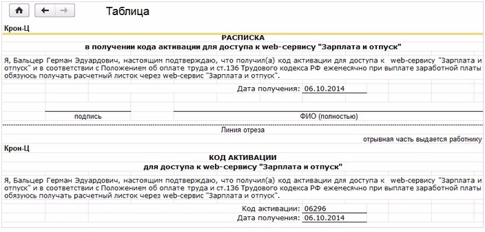 При нажатии на кнопку Печать будет сформирован табличный документ с распиской в получении кода активации: