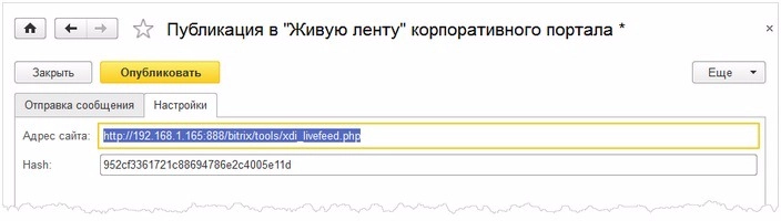 На закладке Настройки устанавливаются настройки для отправки сообщений в живую ленту: