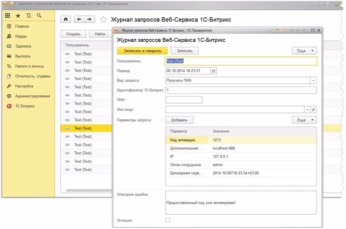 - При нажатии на Тест запросов Веб-Сервиса 1С-Битрикс запускается обработка, позволяющая тестировать работу функционала расчетных листков.
