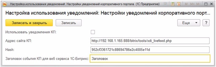 - При нажатии на Настройки уведомлений корпоративного портала открывается форма, в которой указываются константы, требующиеся для отправки уведомлений на портал.
