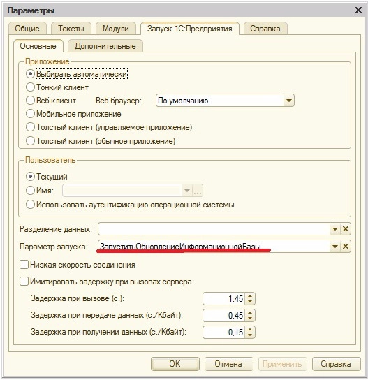 § чтобы запустить из конфигуратора, откройте Сервис > Параметры. На вкладке Запуск 1С:Предприятия укажите параметр запуска: