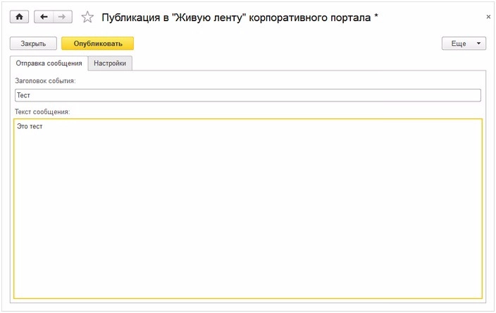 - При нажатии на Публикация в "Живую ленту" корпоративного портала запускается форма, позволяющая отправлять информацию в живую ленту портала.