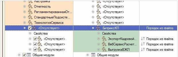 - Вызовите режим Сравнить, объединить с конфигурацией из файла из меню Конфигурация. В этом режиме будут показаны только различающиеся объекты дополнения и используемой конфигурации, поэтому полностью идентичные объекты могут отсутствовать в окне сравнения-объединения. Также может отсутствовать флажок включения таких объектов в объединение.