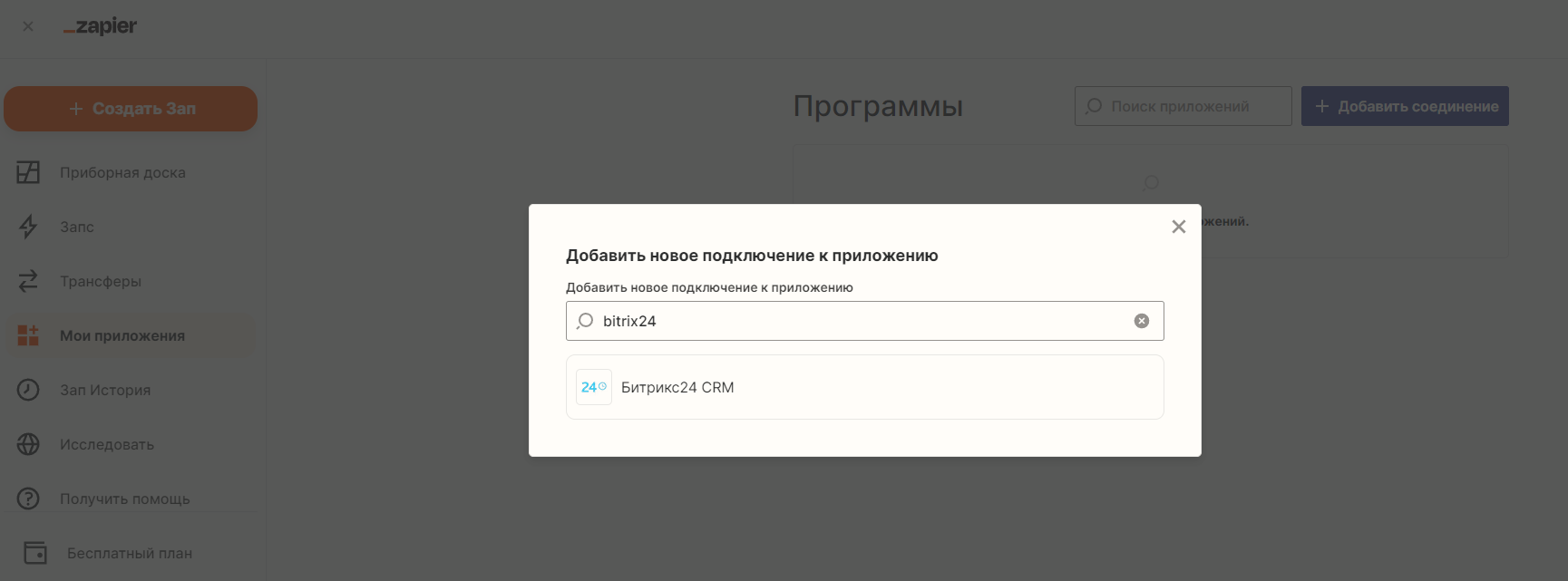 После регистрации переходим в личный кабинет Zapier и настраиваем подключение с Битрикс24: