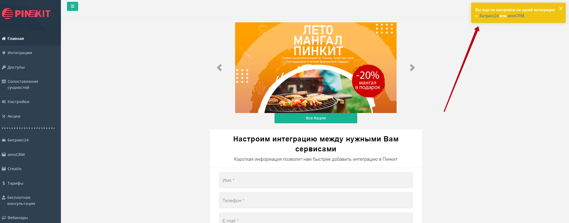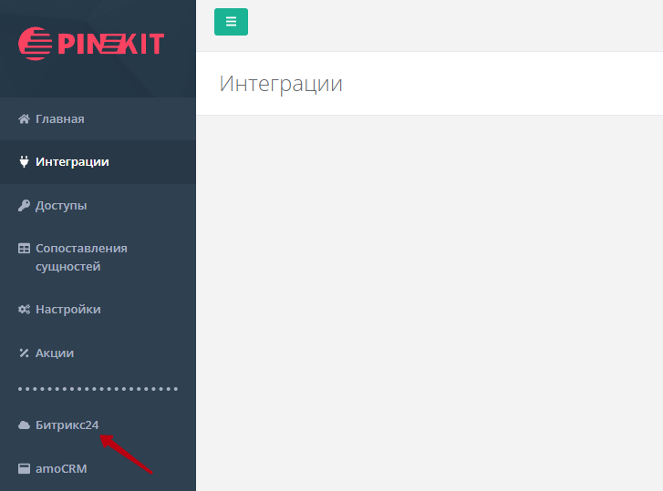 Зарегистрируйтесь по ссылке в личном кабинете Пинкит. После успешной авторизации система предложит вам выбрать между Битрикс24 и amoCRM.