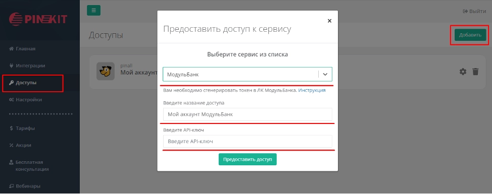 Заходим в личный кабинет Пинкит, открываем раздел "Доступы", нажимаем "Добавить". Выбираем "МодульБанк", указываем название доступа (может быть любым) и вставляем ранее полученный токен.