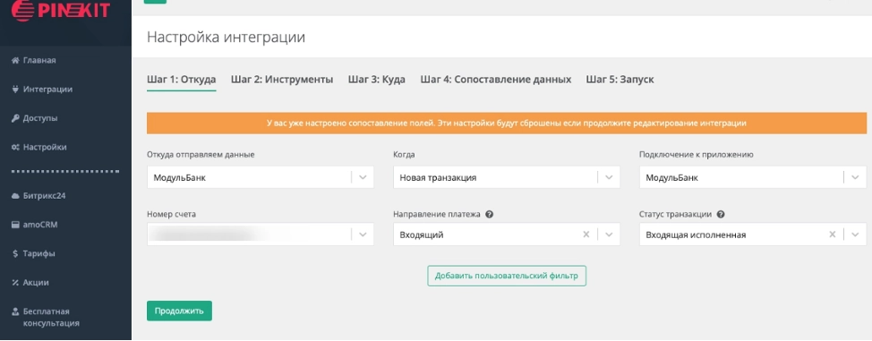 RSSПодробно рассматриваем настройку автоматической выгрузки данных из Модульбанка в Битрикс24 в личном кабинете Пинкит 2.0.
