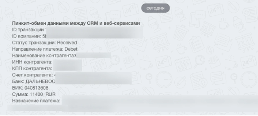 Финансы – одно из важнейших направлений в работе любой компании. Немалую ее часть занимает отслеживание движения финансовых средств, а именно: разнос платежей по клиентам, уведомление нужных сотрудников. Подключение интеграции с банком значительно упрощает этот процесс, автоматизируя некоторые моменты. Оповещения о перемещении денежных средств (со всей необходимой информацией по транзакции) бухгалтера, руководителя и ответственного менеджера не позволят забыть ни про одну сделку.