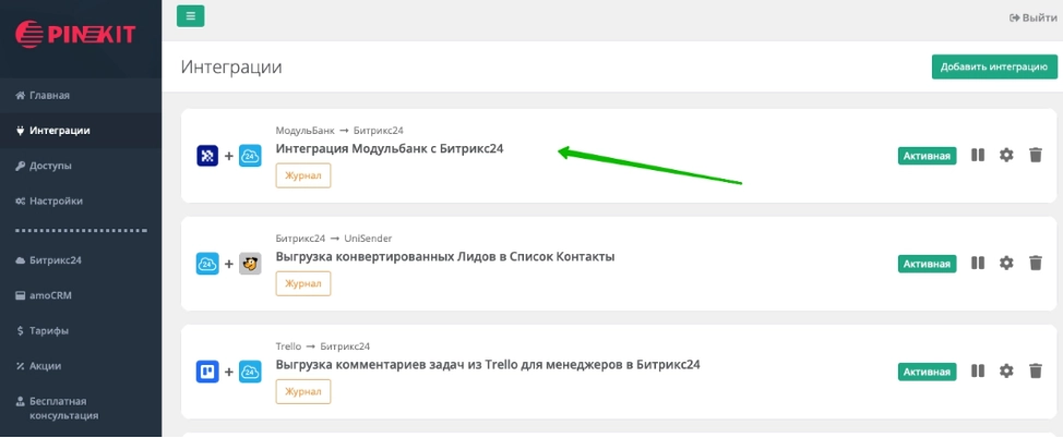 Созданная интеграция появится в общем списке во вкладке "Интеграции". Здесь ее можно приостановить, изменить настройки, удалить и посмотреть Журнал.