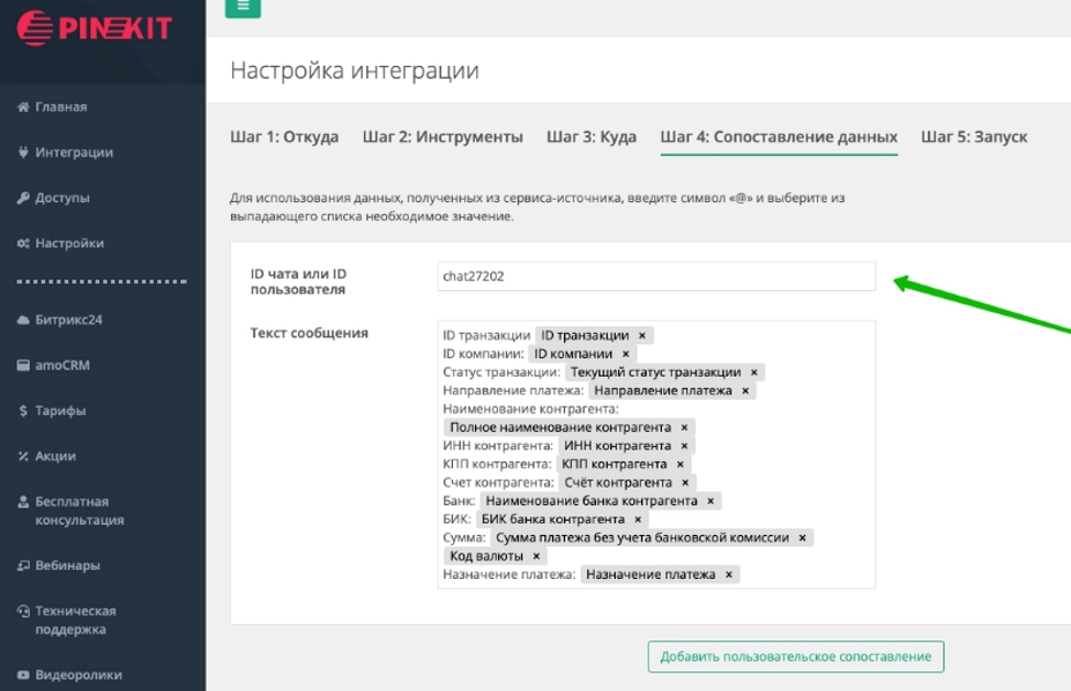 На шаге "Сопоставление данных" указываем ID чата или ID пользователя, который будет получать сообщения (формат ID для чата – "chat14", для пользователя – "256"). Перечисляем все интересующие поля из транзакции и добавляем к ним подписи.