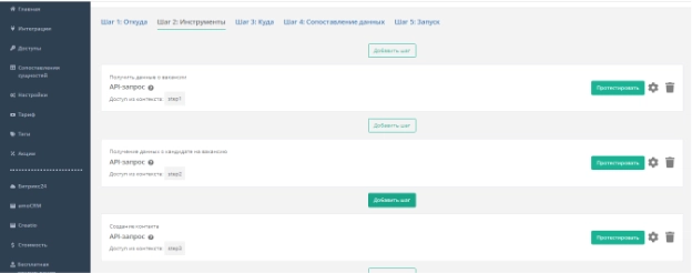 Самые востребованные интеграции по API: Google Sheets, Unisender, СберБанк, HH.ru, Контур.Фокус, GetCourse, Банки, iiko. |