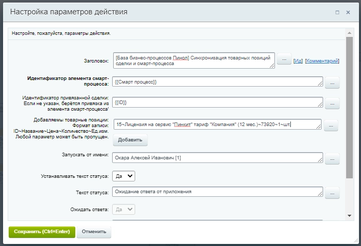 Так с помощью активити на Базе бизнес-процессов Пинол на платформе Пинкит «Синхронизация товарных позиций сделки и смарт-процесса» мы можем за несколько минут полностью автоматизировать передачу данных между двумя сущностями, освободить рабочее время сотрудников и избежать возможных ошибок в ручном переносе данных менеджерами.