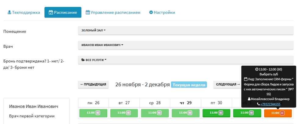Вторым недостатком, на наш взгляд, является то, что в штатном функционале нет возможности расписать время приема. То есть, можно забронировать услугу на абсолютно любое время, включая нерабочее (в том числе ночное) или когда специалист уже занят: