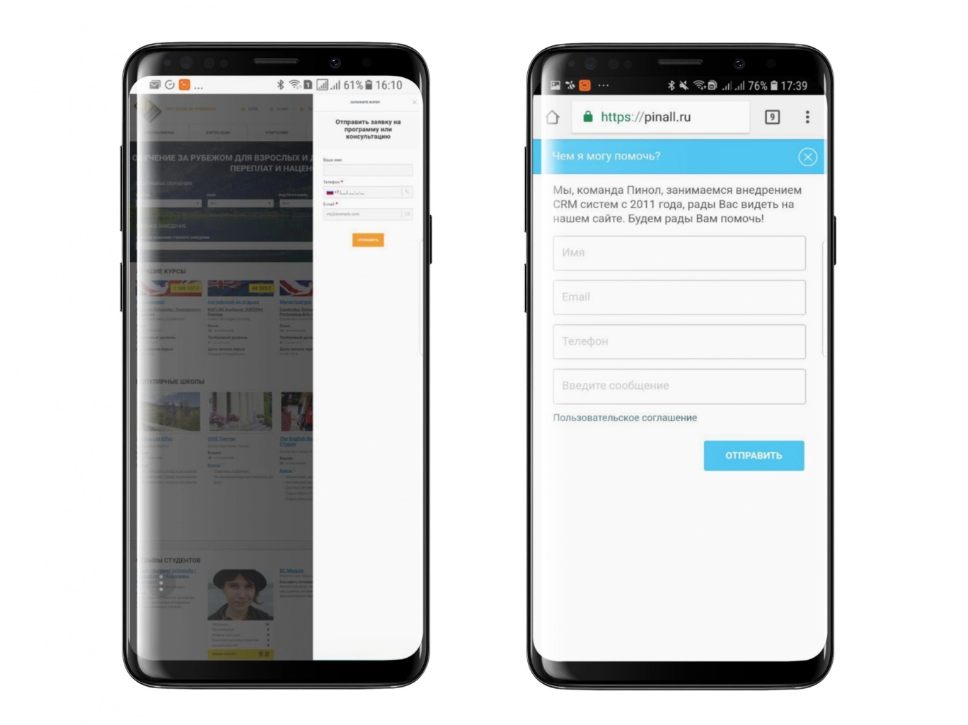 Рис. 9. Слева скриншот сайта с CRM-формой виджета Битрикс24, справа - форма LiveTex при просмотре сайта с мобильного.