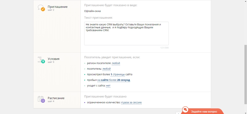 Как мы говорили в начале статьи, задача виджета - удержать посетителя на сайте, дополнительно мотивировать его отправить свои данные, сделать заявку, купить товар. Поэтому очень важно, как выглядит виджет на сайте и как гибко можно настроить сценарии его появления.