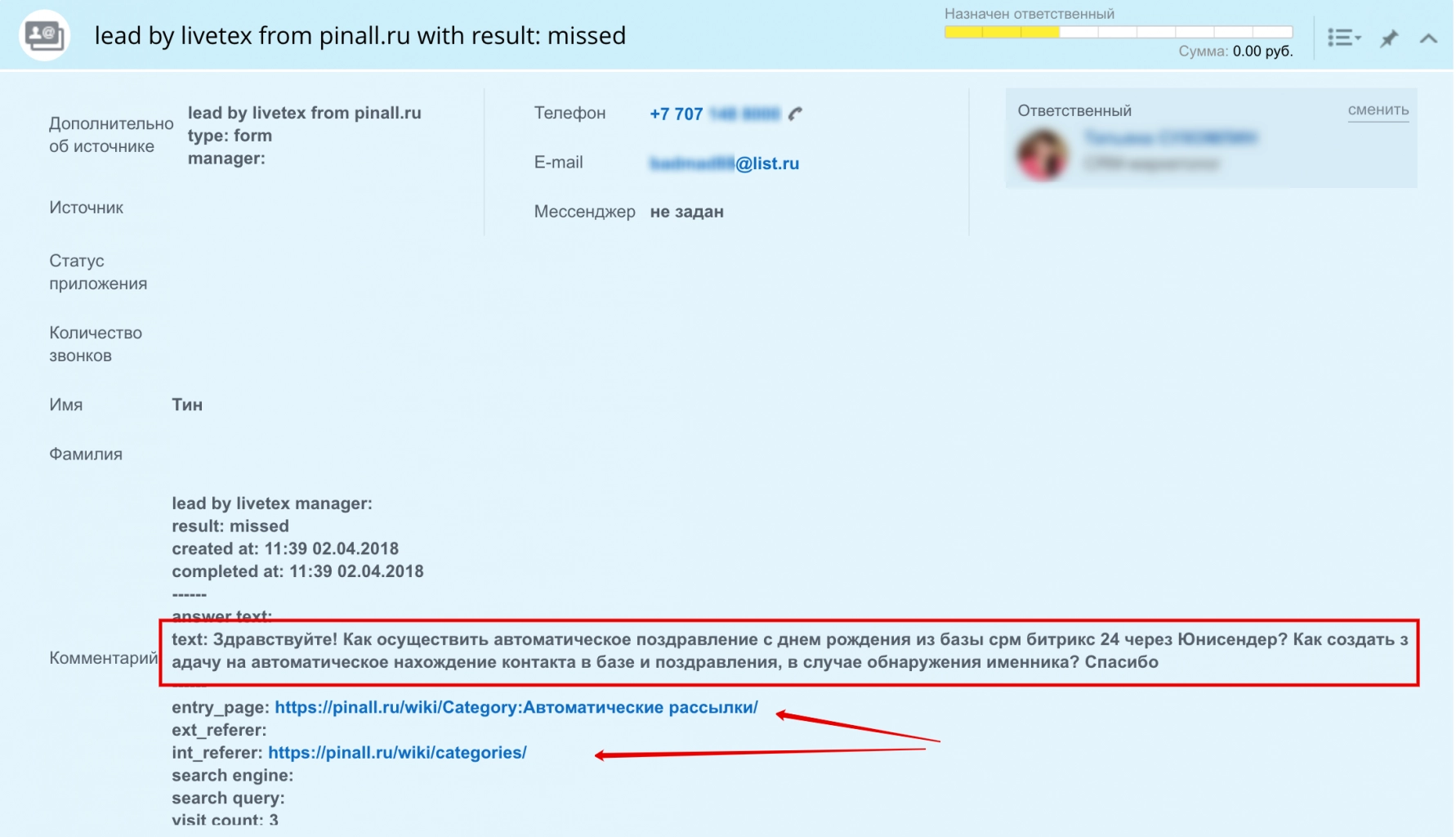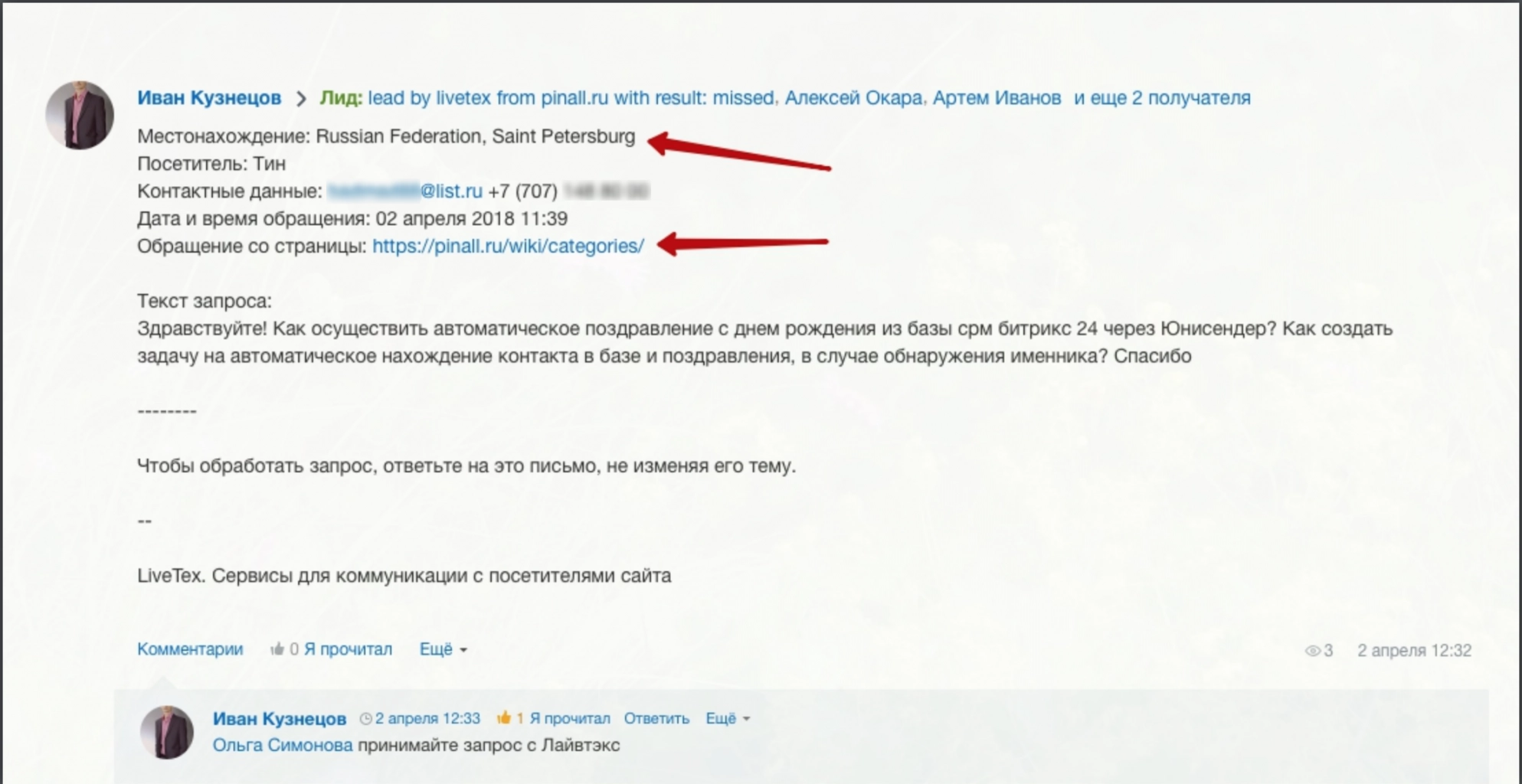 А вот, какой лид получим при использовании интеграции LiveTex и Битрикс24: