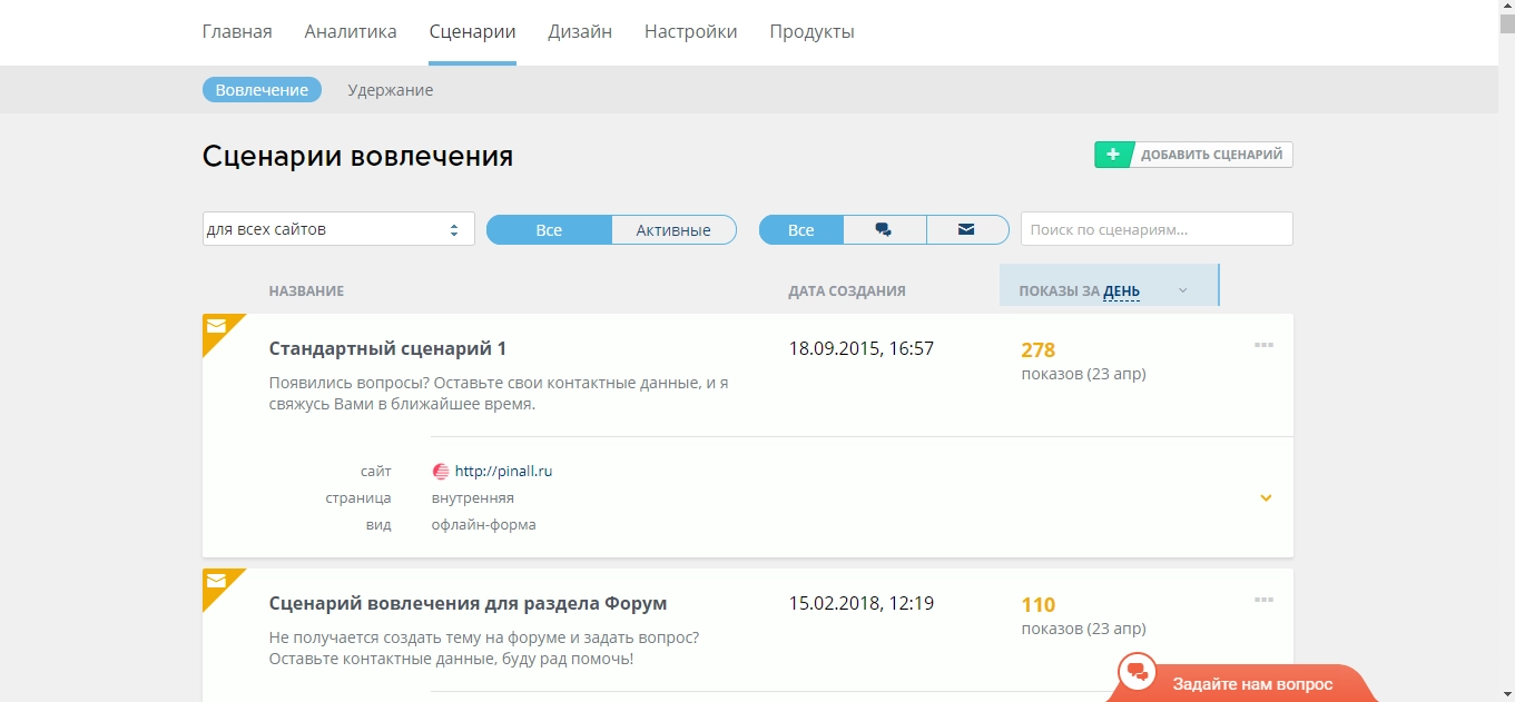 Все созданные сценарии вовлечения находятся в личном кабинете LiveTex. Здесь можно просмотреть статистику показов по каждому сценарию за день и при необходимости быстро отредактировать сценарий вовлечения для конкретной страницы, поменяв текст или параметры сценария.