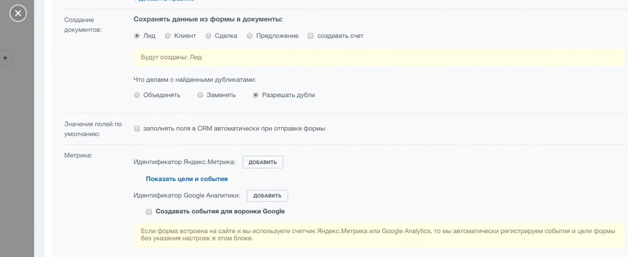 Данные, которые отправляет пользователь с сайта через CRM-форму, попадают в Битрикс24. В зависимости от того, какой вариант был выбран в настройках, будет создан: лид, контакт, сделка или предложение. Тут же в настройках выбирается вариант реакции Битрикс24 на дубликаты: объединять дублирующиеся сущности, заменять старые на новые или создавать повторяющиеся сущности. Также можно подключить Яндекс.Метрику и Google Аналитику: