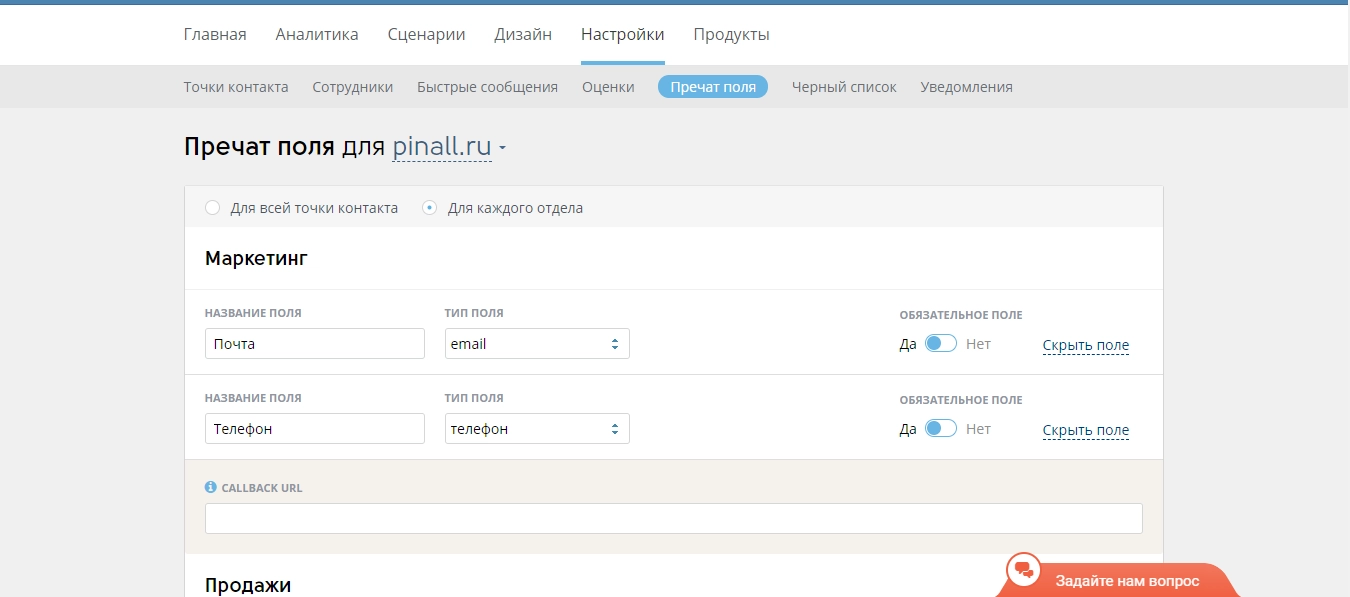 Рис. 15. Настройка пречат полей в LiveTex.