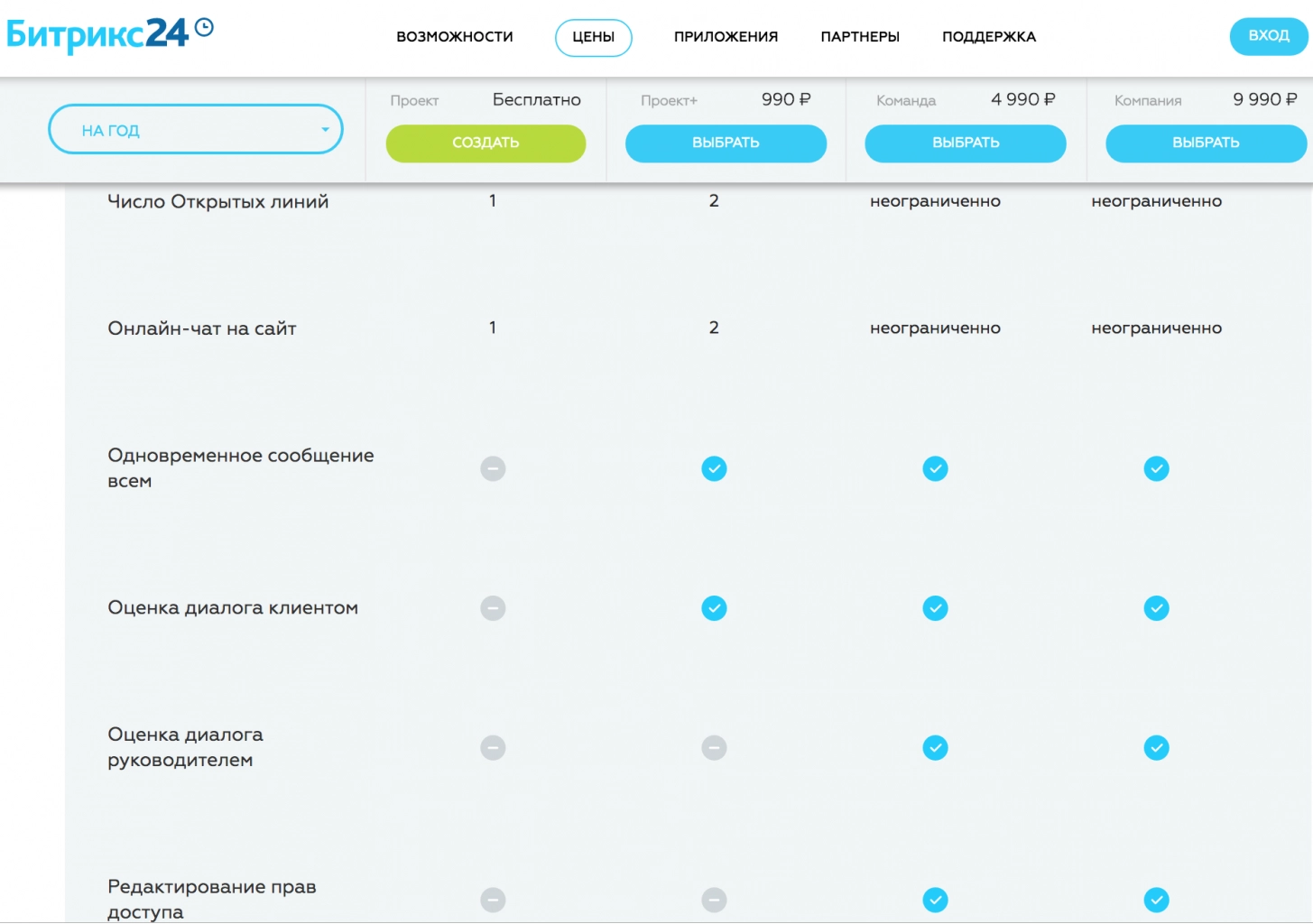 Как говорилось выше, вы можете бесплатно использовать Битрикс24 и виджет на сайт. Если же нужно больше функционала, то выбирайте подходящий для себя тарифный план Битрикс24: