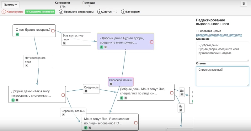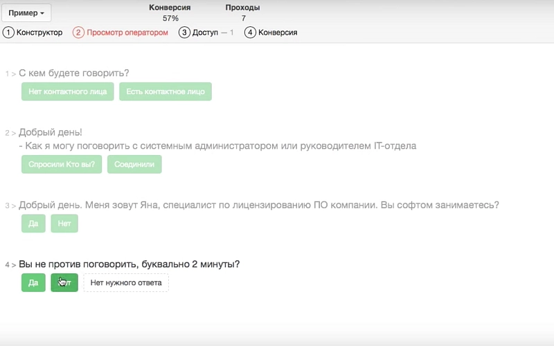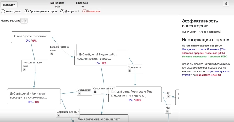 HyperScript — инструмент для увеличения эффективности телефонных продаж через создание скриптов (алгоритмов) телефонных разговоров. Онлайн-сервис HyperScript позволяет легко создавать и менять скрипты в конструкторе в каком угодно направлении, просматривать последние действия и сравнивать результаты, анализировать конверсию скриптов, упрощает обучение сотрудников алгоритмам разговора с клиентами.