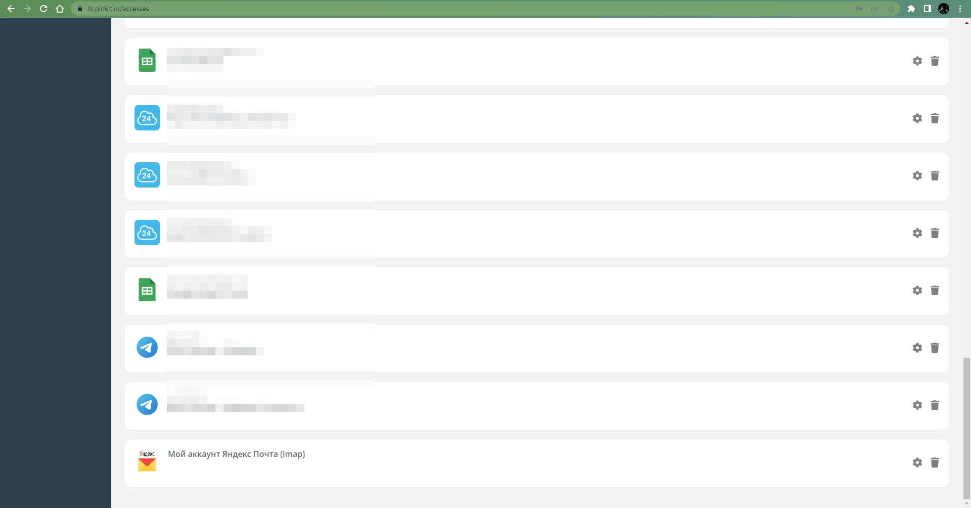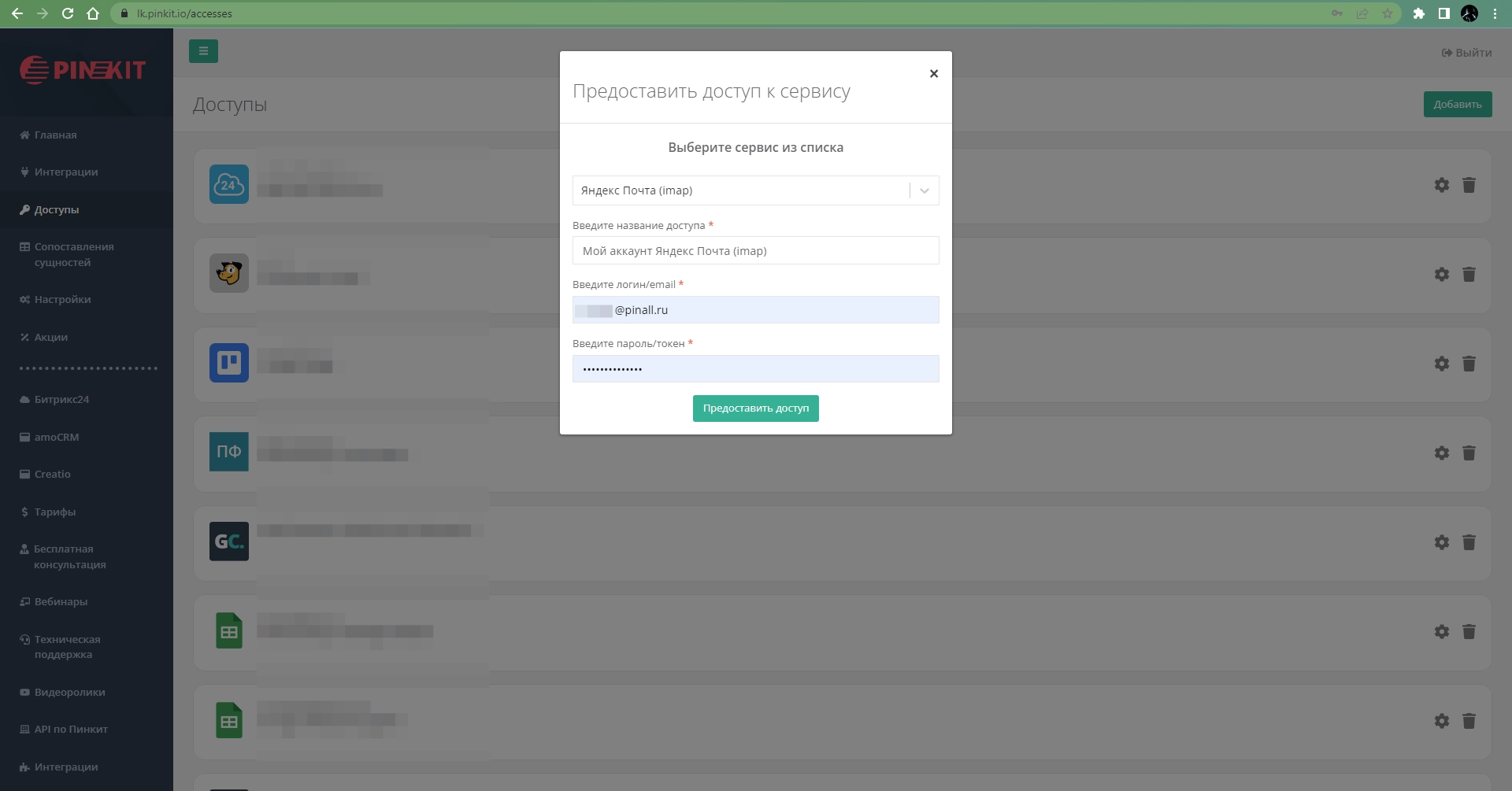 В личном кабинете Пинкит на вкладке "Доступы" с помощью кнопки "Добавить" предоставляем доступ к почте: выбираем Яндекс Почта, вводим название доступа, добавляем почтовый логин и пароль к нему: