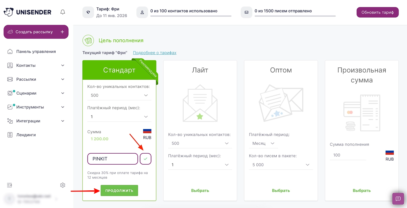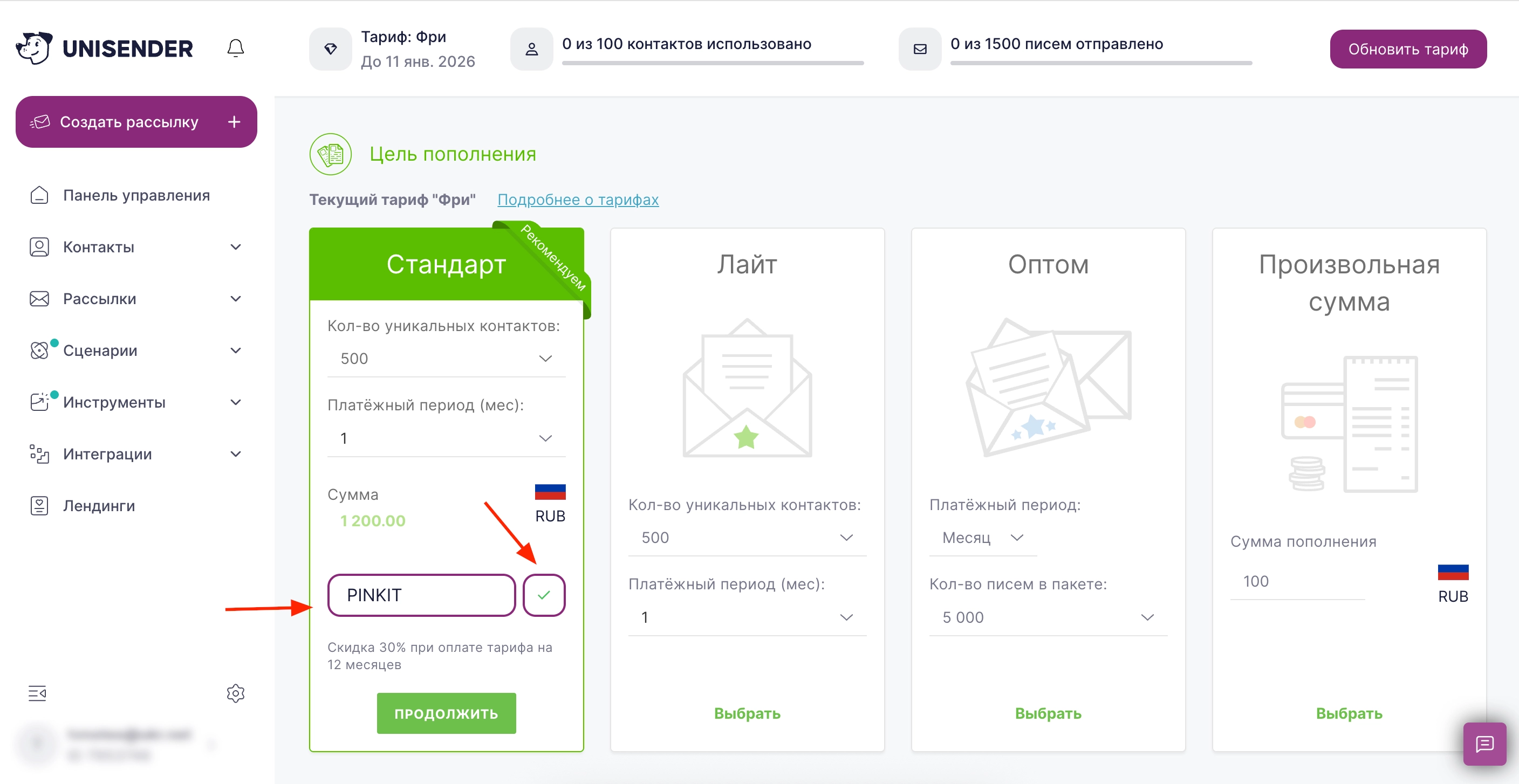4. Выбрать нужный тариф и ввести промокод PINKIT.