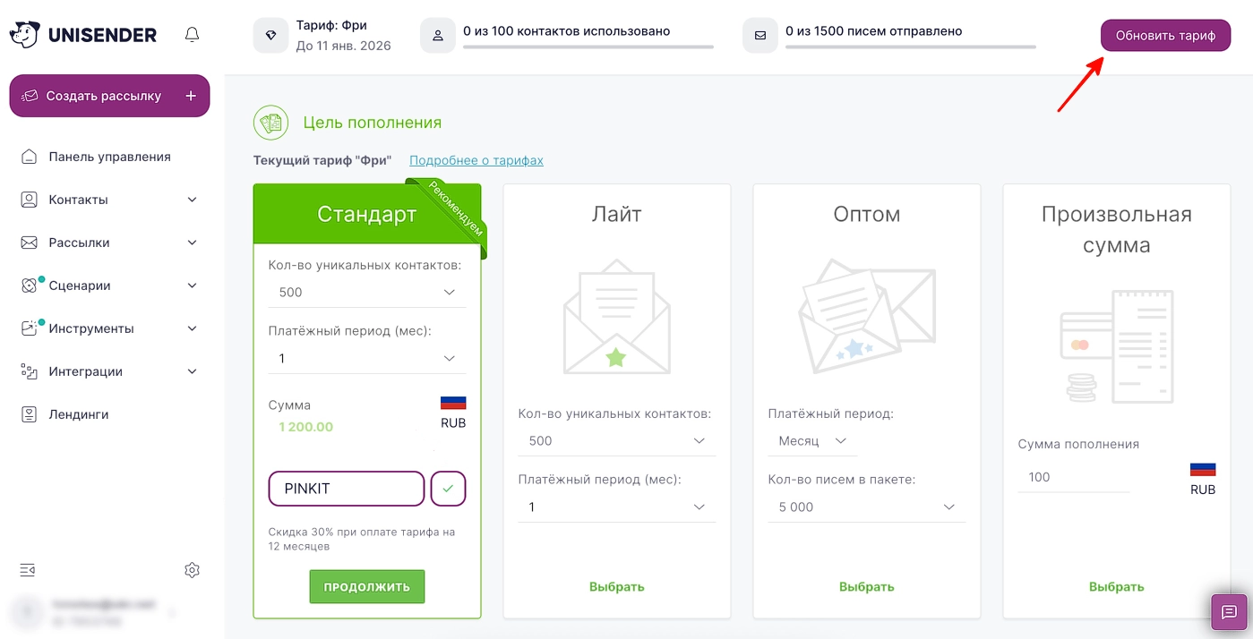 3. Зайти в свой новый личный кабинет Unisender и нажать кнопку "Обновить тариф".