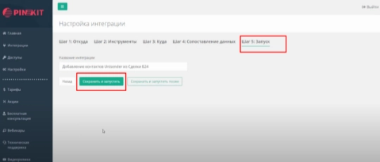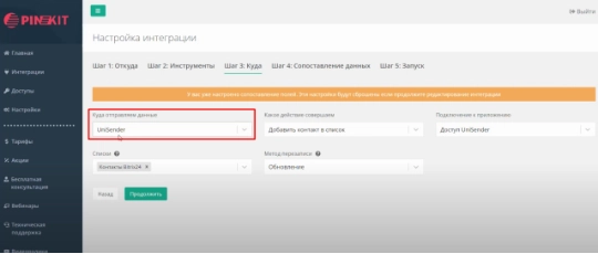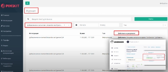6. Результат работы интеграции можно увидеть в журнале в личном кабинете Пинкит и в списке контактов UniSender
